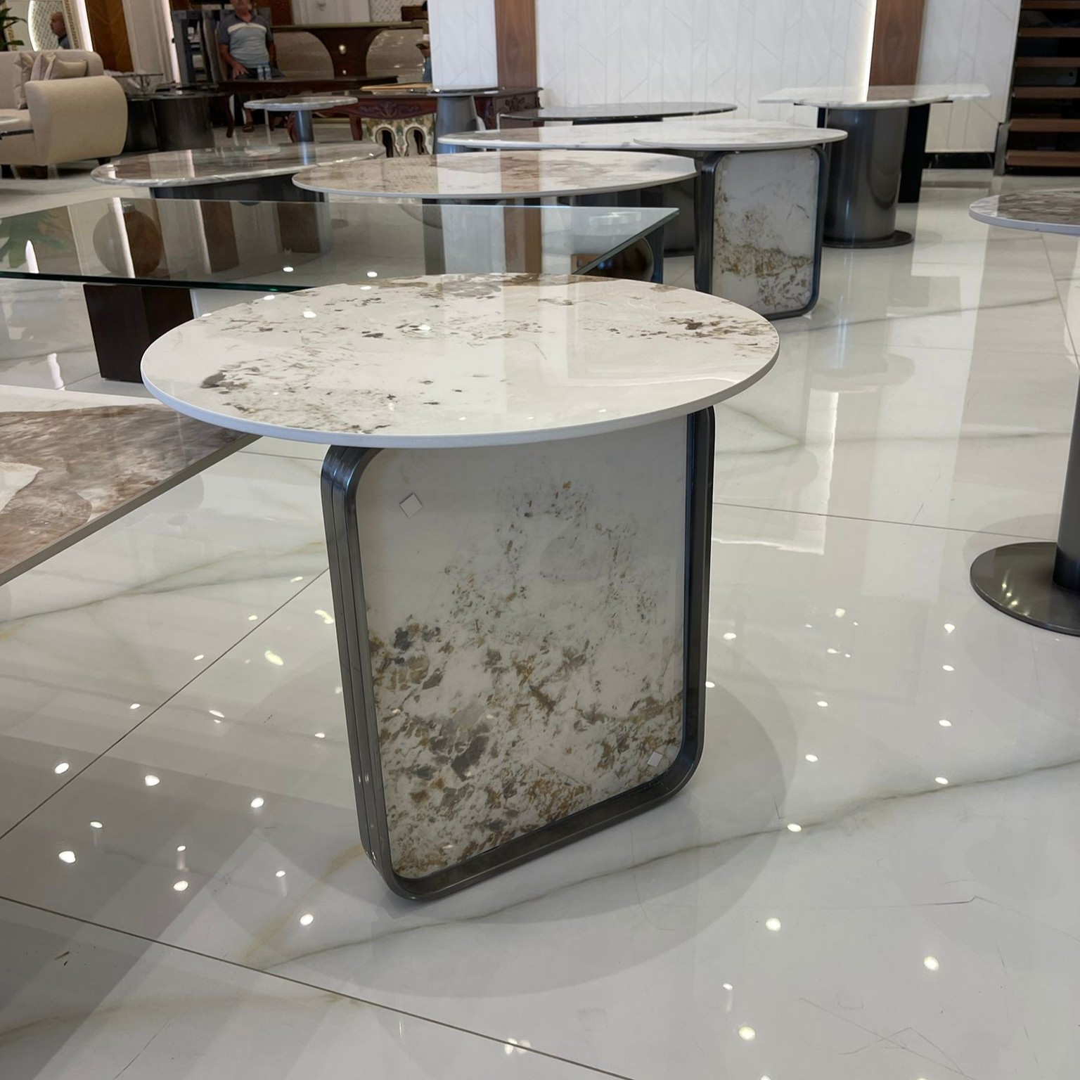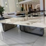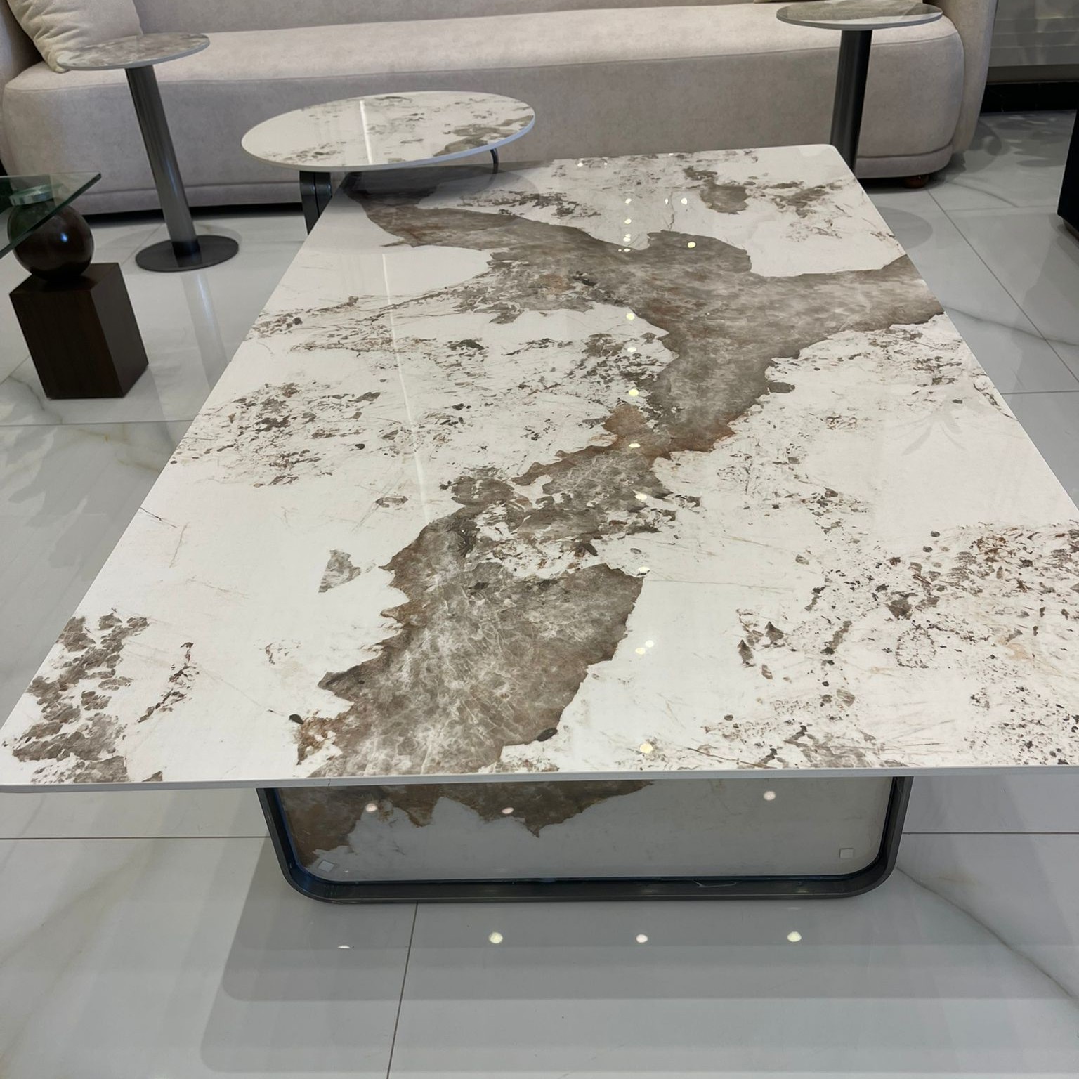يتميز طقم طاولة القهوة بتصميم عصري فاخر يجمع بين الأناقة والبساطة. أسطح الطاولات مصنوعة من الرخام الطبيعي بدرجات الرمادي والبيج مع عروق بيضاء فاتحة وداكنة مما يضفي على القطع مظهراً غنياً وراقياً مليئاً بالطابع الطبيعي.