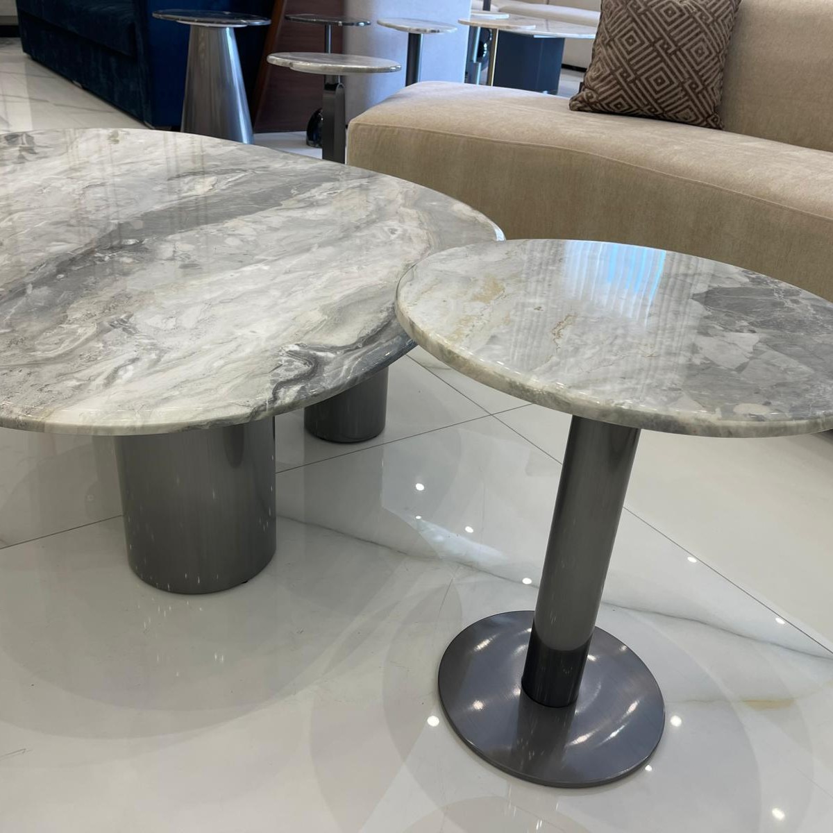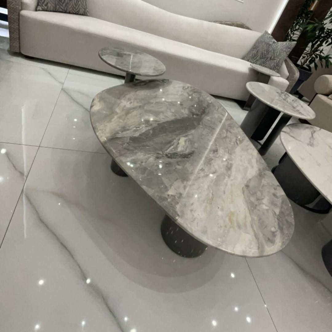 The coffee table set features a luxurious modern design that combines elegance with simplicity. The tabletops are made of natural marble in shades of grey and beige, accented with light and dark white veining, giving the pieces a rich, sophisticated look full of natural character.