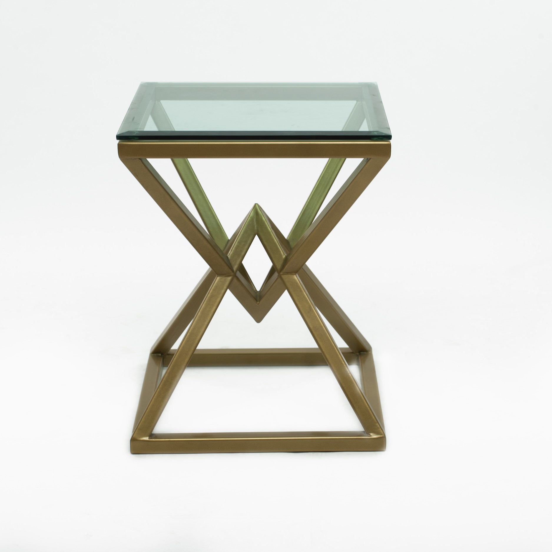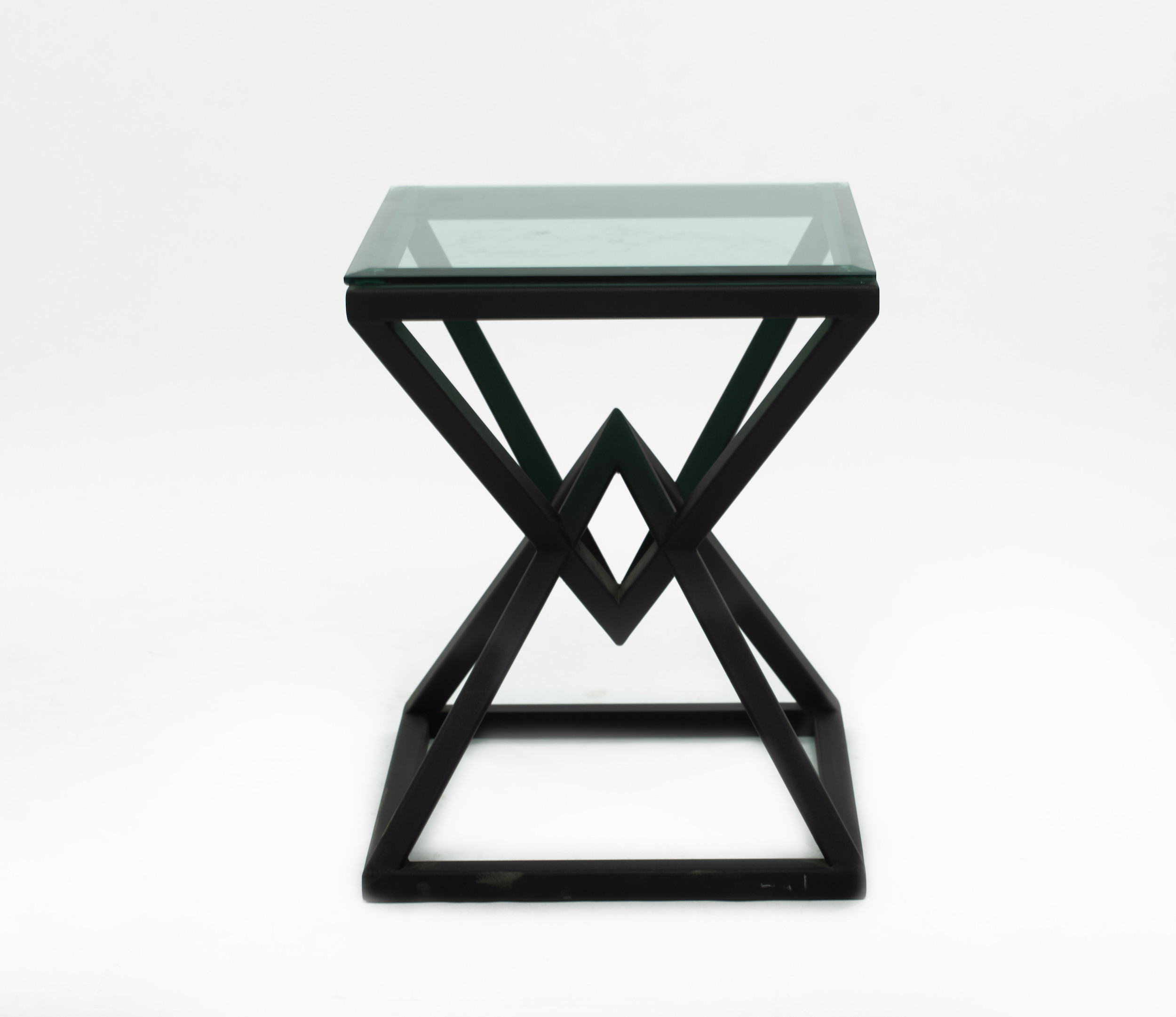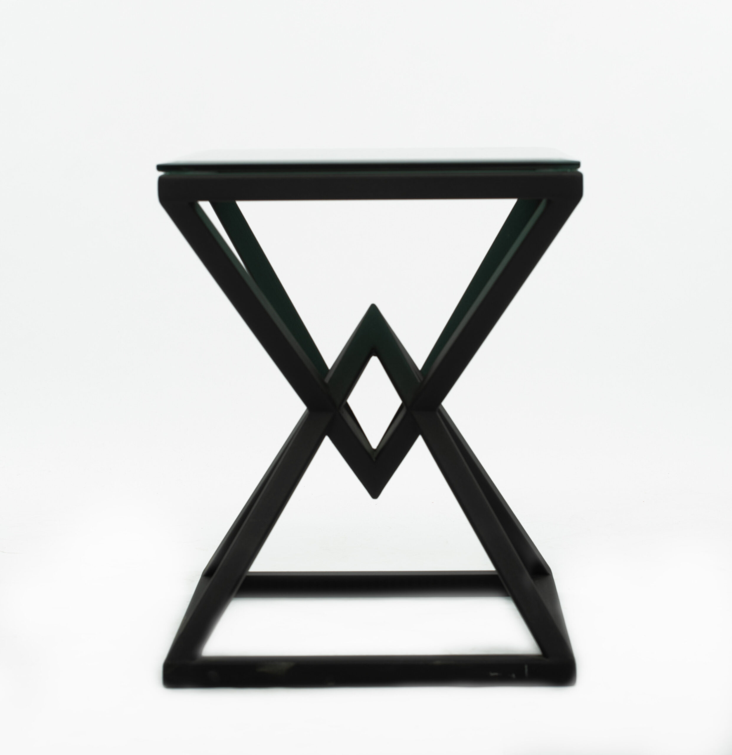 A modern Elegant diamond shaped table with a glass surface, made of steel and specially painted in black color powder coating