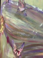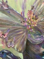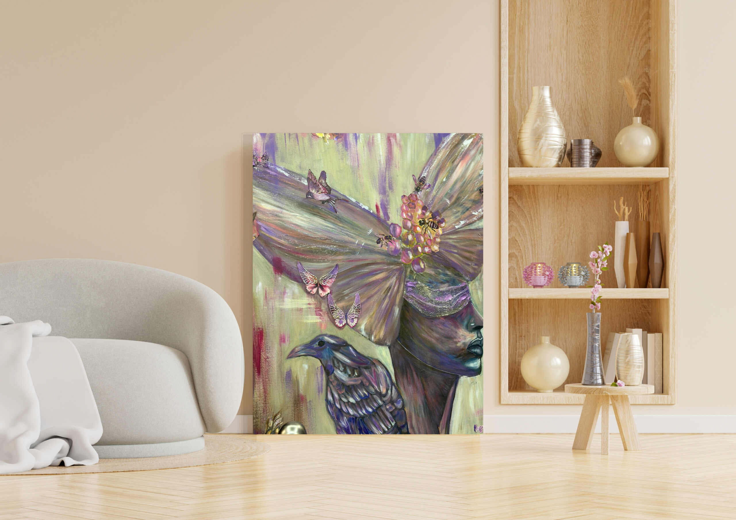 This painting depicts a strong woman, her eyes closed, as if listening to an inner calling or guarding a natural secret. The turban, shaped like butterfly wings, symbolizes transformation and rebirth, while the bees surrounding her symbolize tireless work and the interconnectedness of ecosystems. The black bird stands firmly on her shoulder, symbolizing wisdom and silent observation. The painting’s sensual background colors add a spiritual dimension, making the woman a symbol of silent strength and a deep connection to the earth.