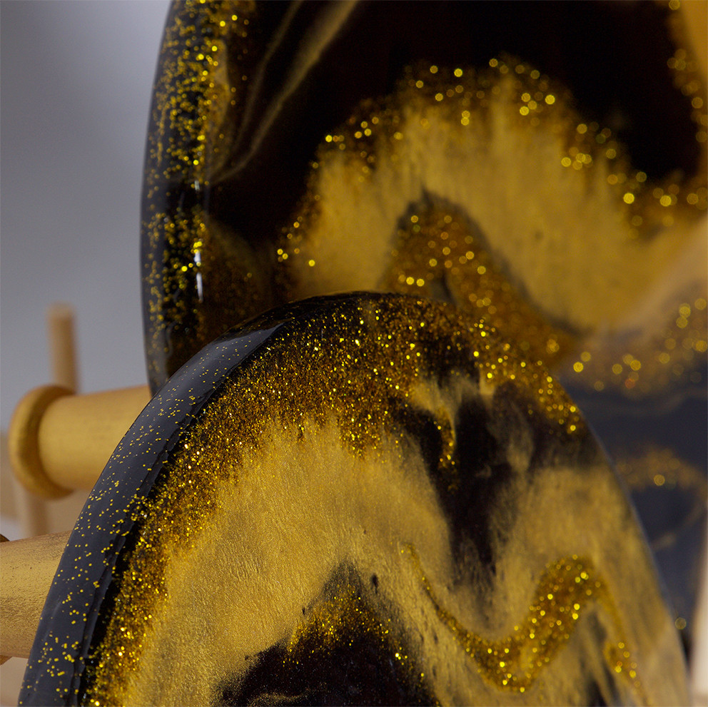 Large wooden flat platter with handle, coated with a layer of resin in a stunning green and white marble with drops of gold to charm your guests